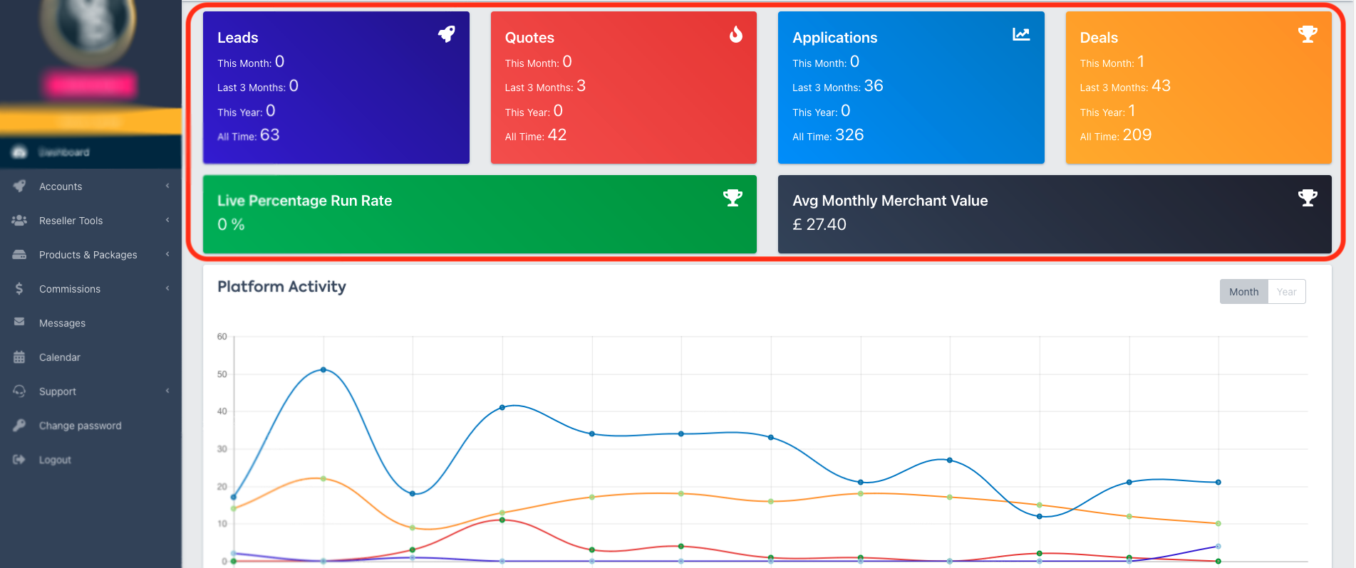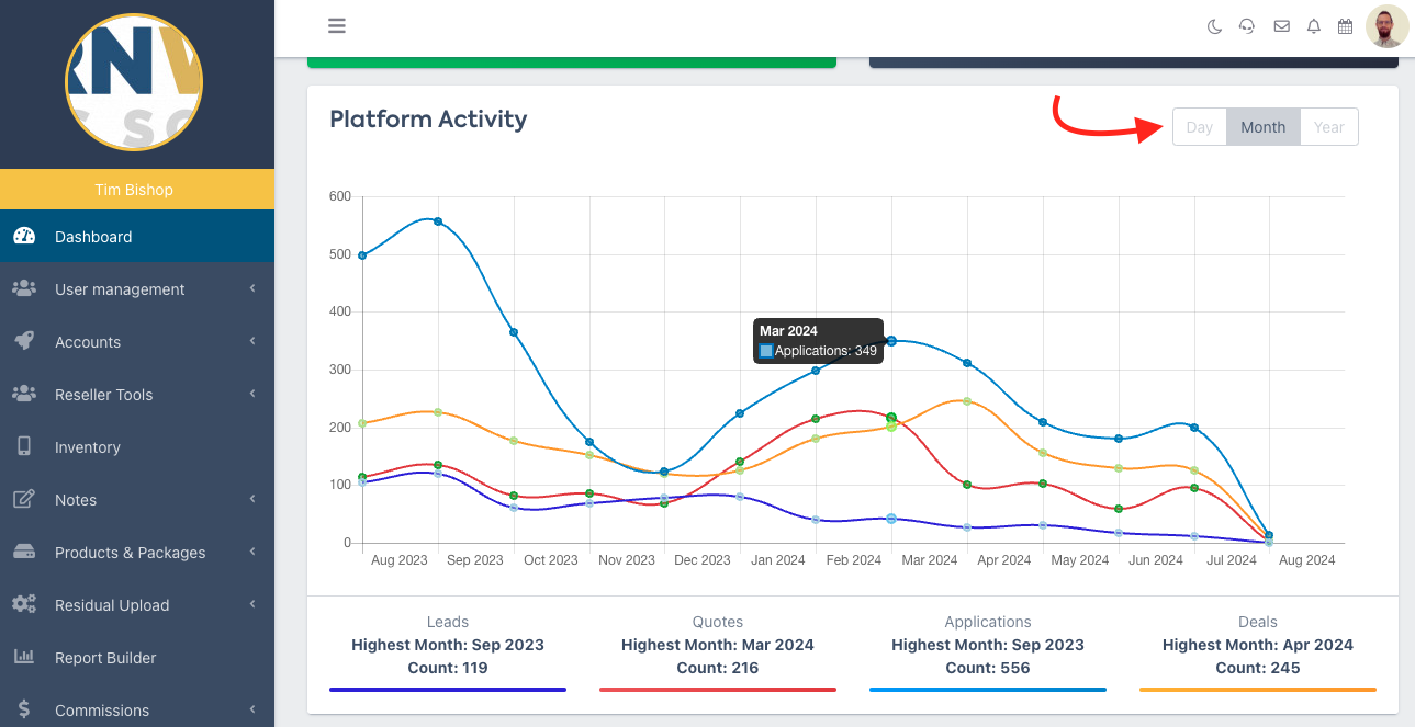 Next, the Platform Activity section shows a graph of your Leads, Quotes, Applications and Deals by month, or year.