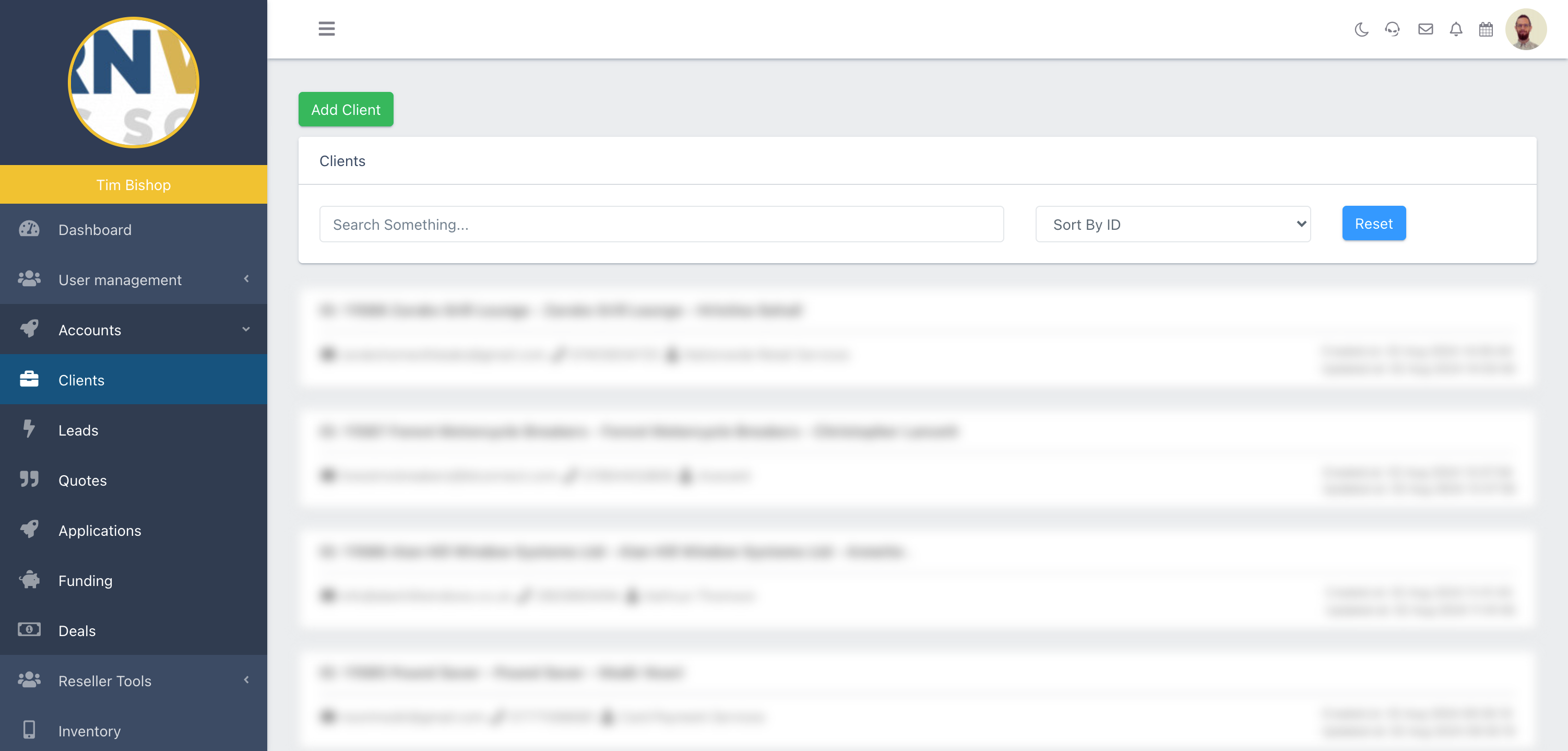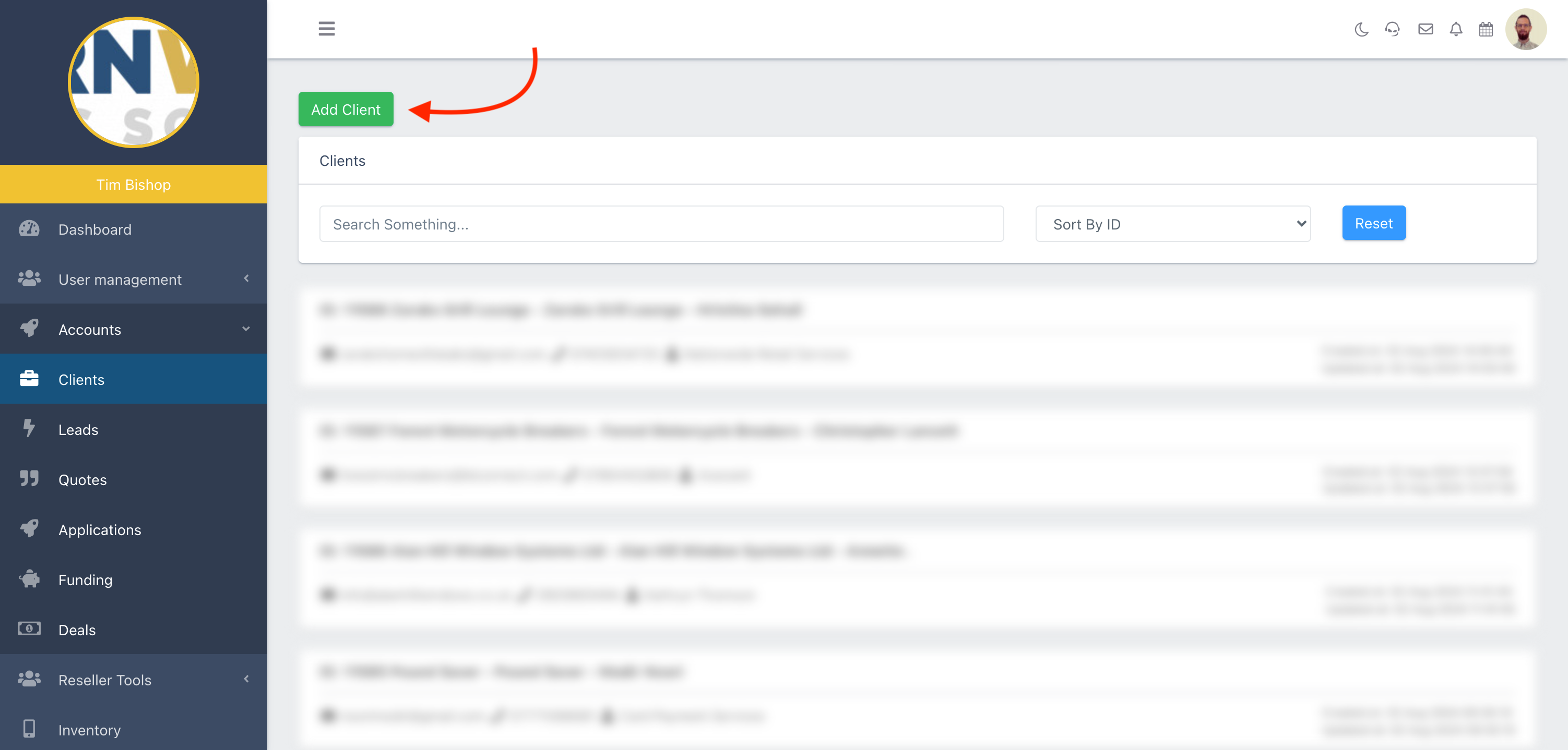 From here, you can search for clients by name, or sort them by ID, date created, or date added.