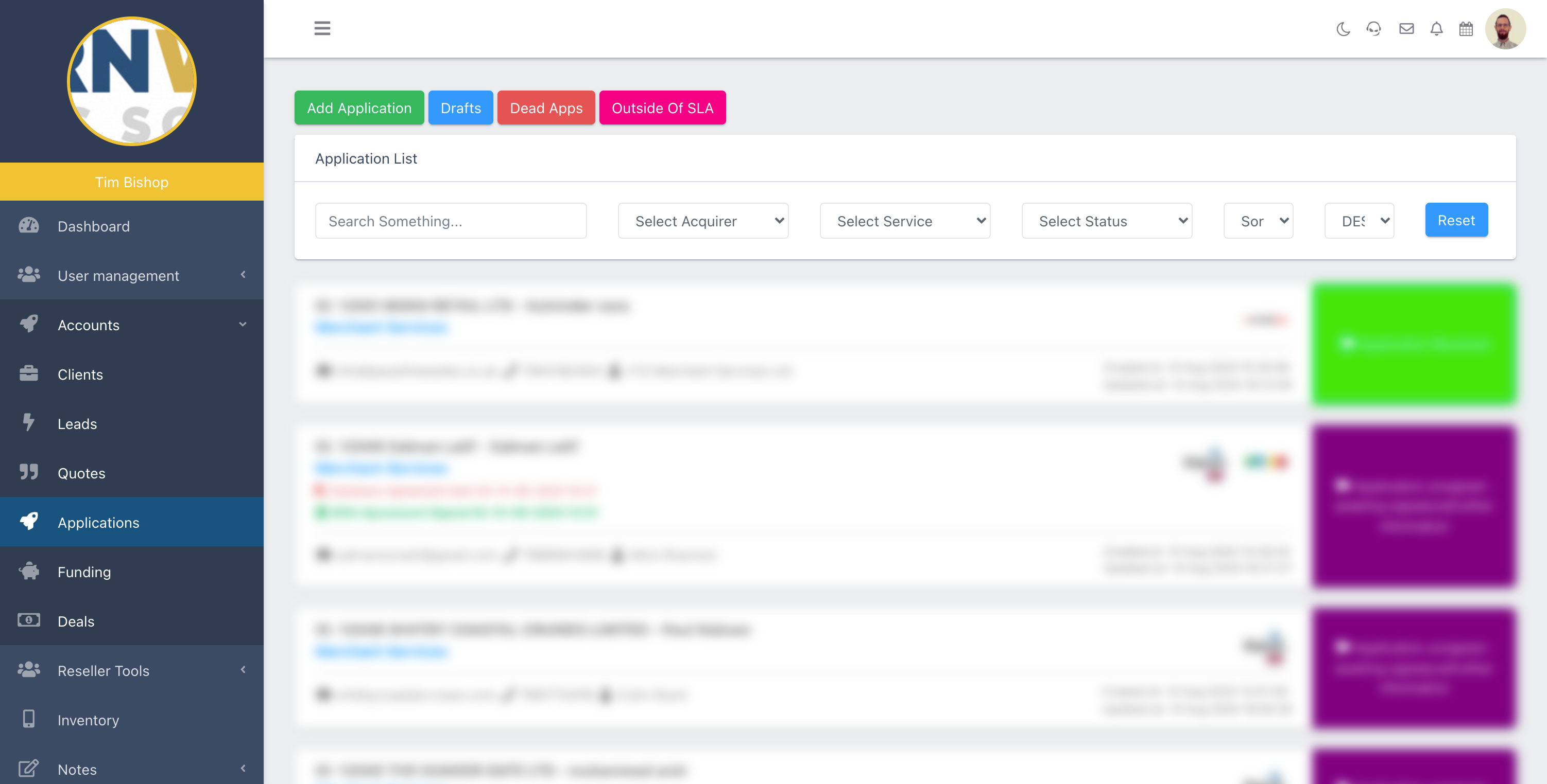 In this section of the Partner Portal, you can see all your Applications, filtering them by Acquirer, Service, Status, or Sorting by ID, Created or Updated, in Ascending or Descending order.