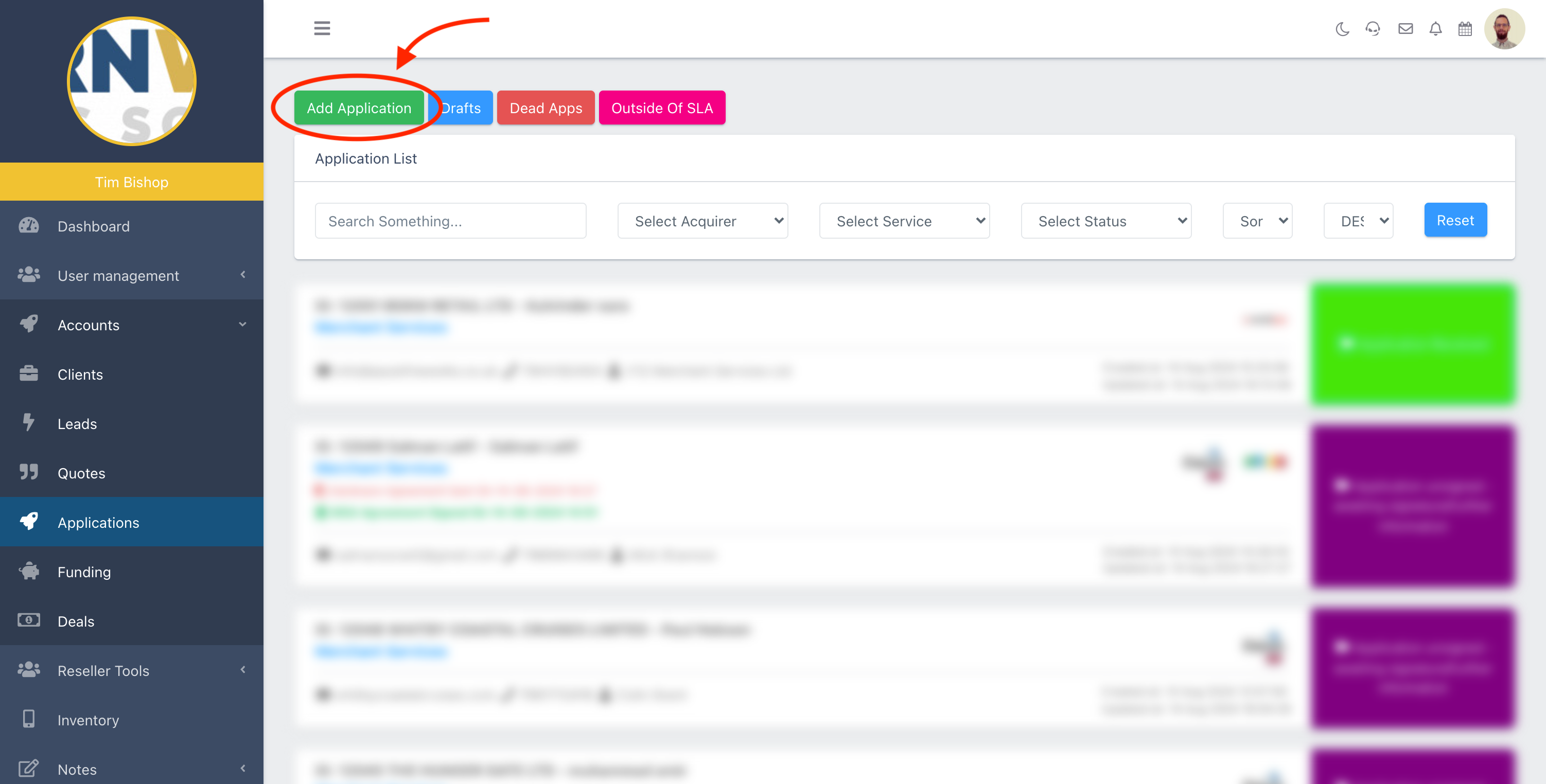 To start a new application for Merchant Services, select 'Add Application' at the top of the Applications page.