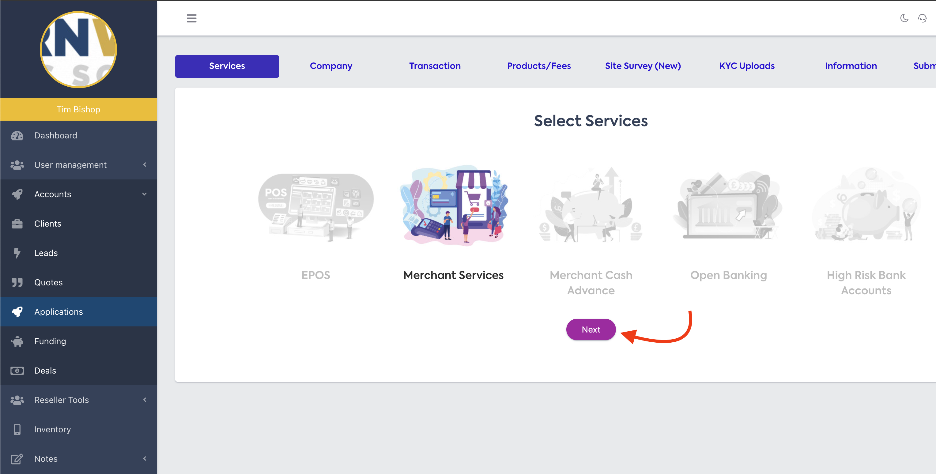 Here you can select one, some, or all of the services you're applying for on behalf of the Merchant.