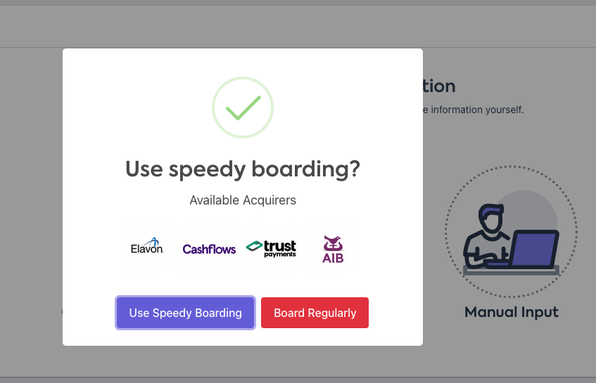 When applying for Merchant Services you can select either Speedy Boarding or Regular Boarding from the popup that appears.